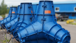 Формы разборные. Состоят из одной нижней детали — основания и трех формообразующих деталей. Бетонный состав заливается через верхнюю горловину изделия. Формы производят из листов металла с усилением по контурам.