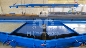 Металлоформа представляет собой неразборную конструкцию треугольного сечения длиной 20 134 мм, шириной 3 825 мм и высотой 790 мм. Габариты изготавливаемого изделия — 17 980 × 3 010 × 300 мм. С торцов силовой рамы установлены упоры для запуска и натяжения арматуры, закрытые защитными кожухами для обеспечения безопасности персонала.